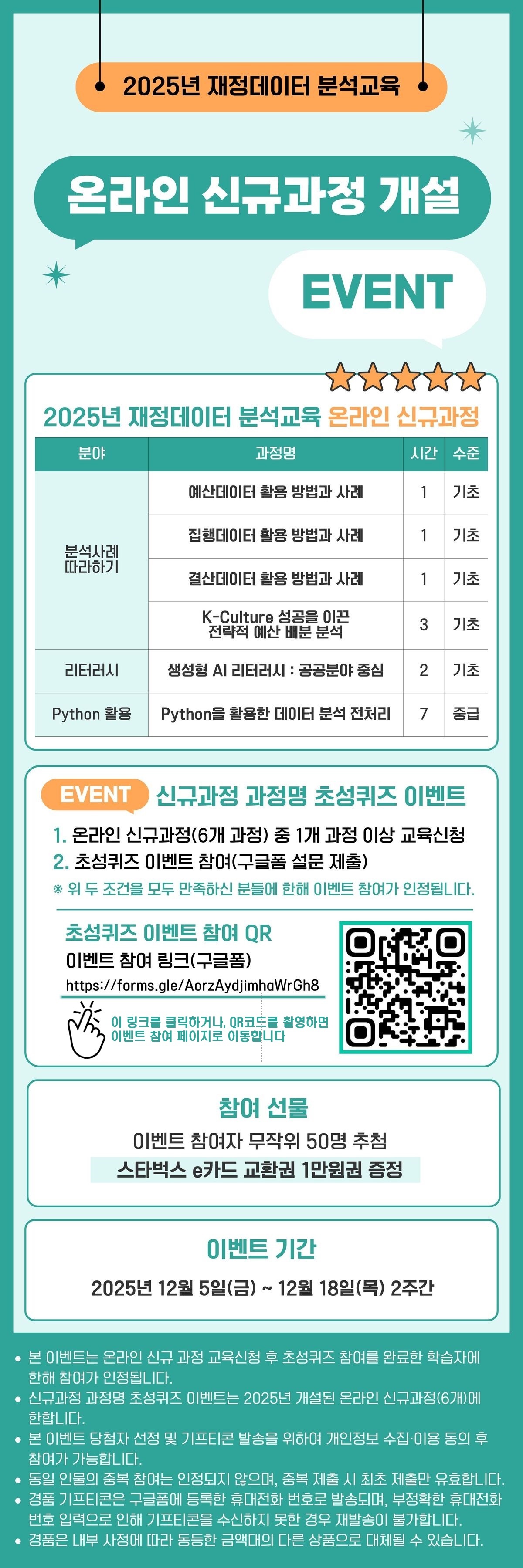 안녕하세요. 한국재정정보원 재정분석교육센터는 재정데이터를 실제 업무에 활용할 수 있도록, ‘재정데이터 분석 교육’을 통해 실무 중심의 분석 역량 강화를 지원하고 있습니다. 이번 온라인 신규 과정 6개 과목 개설을 기념하여 초성퀴즈 이벤트를 마련하였습니다. 온라인 신규 과정을 신청하시고, 초성퀴즈에 참여하신 분들 중 추첨을 통해 총 50명에게 모바일 기프티콘을 드립니다. 온라인 신규 과정에 많은 관심 부탁드립니다. 감사합니다.